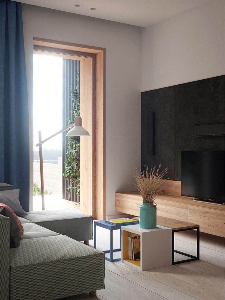 We propose creating a multifunctional space where you can make a choice: either to retire or be together with everybody. The space, clear of all unnecessary items, will take you to another dimension and help you to get tuned to a calm repose. Lot’s of light and air.